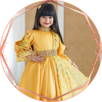 Product Details: Fabric: Premium silk-blend brocade with floral weave Design: Golden frock with gathered flare sleeves & round neckline Detailing: Colorful lace tassels at the waist for a playful touch Accessory: Matching fabric hair bow clip included Style: Ethnic | Festive | Party Wear Occasion: Weddings, festivals, birthdays, family gatherings Size & Fit: Relaxed, easy-to-wear fit for kids’ comfort Lightweight fabric with soft inner lining...