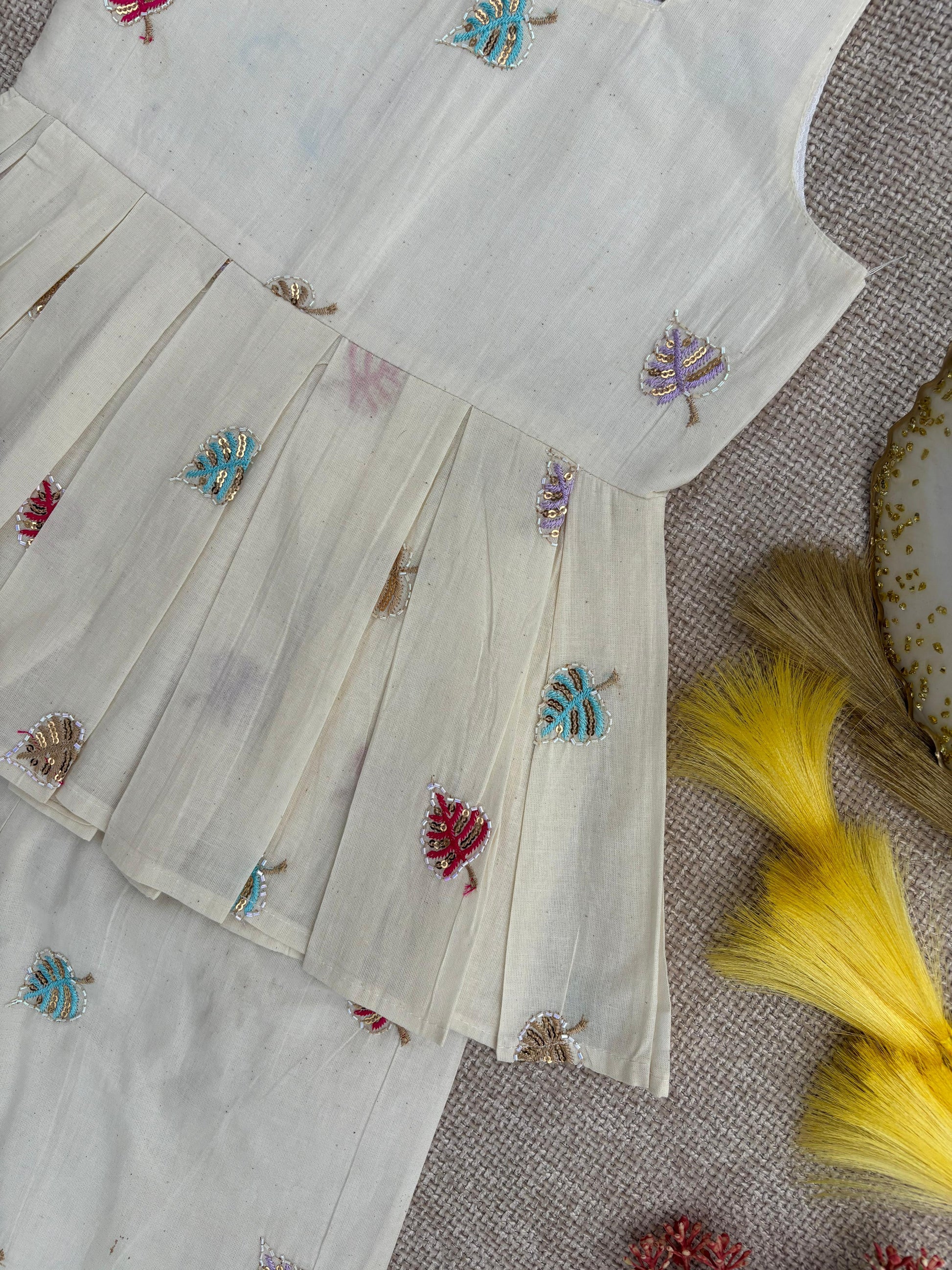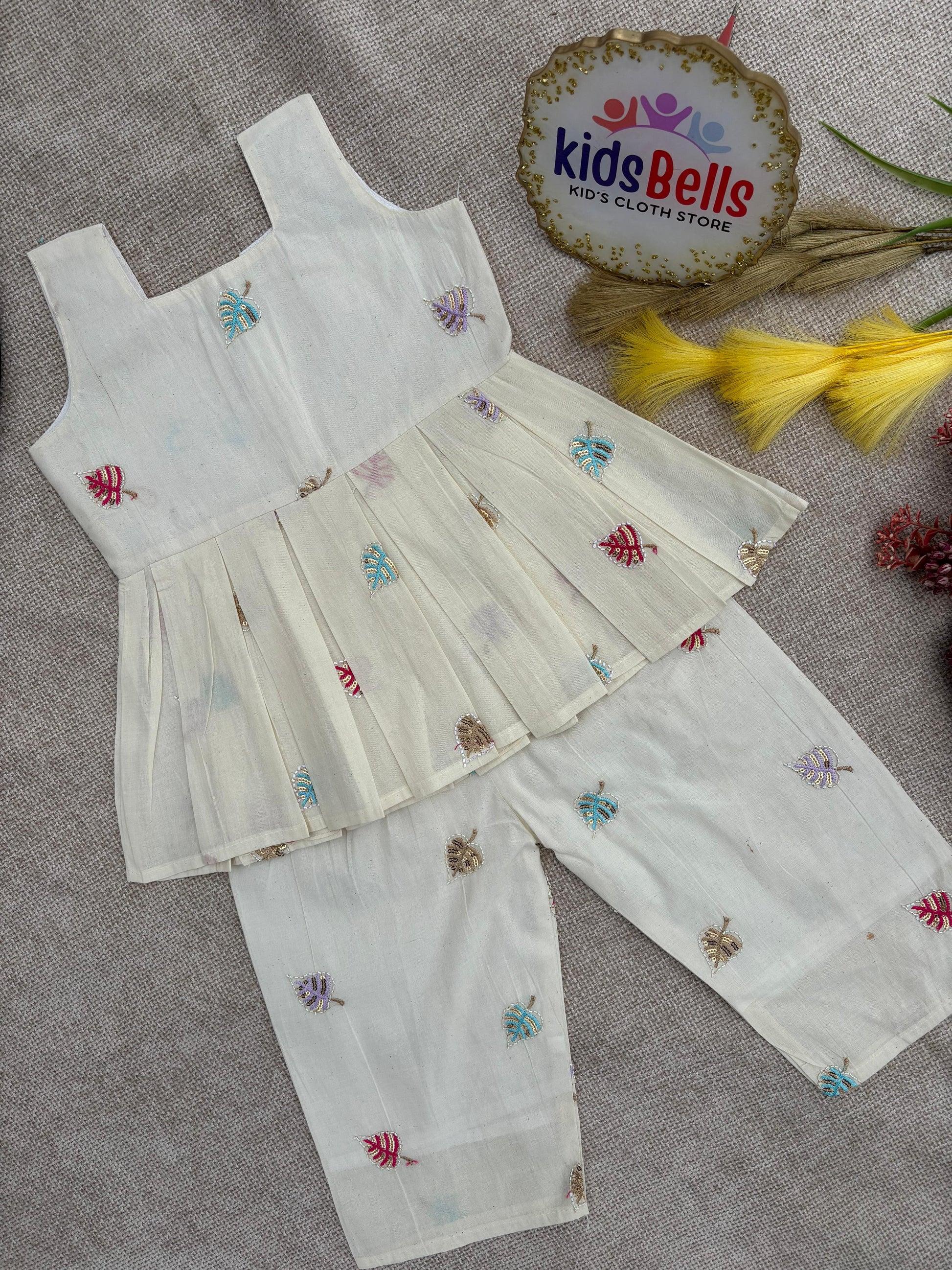 • Matching cream straight-fit pants with multicolour embroidery