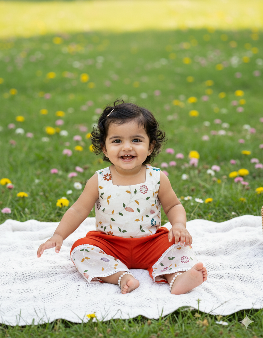 Dress your little one in this trendy and comfortable 2-piece outfit. The set includes a sleeveless cream crop top with colorful floral embroidery, beautifully finished with lace detailing at the hem, paired with vibrant rust-orange palazzo pants. The pants feature embroidered fabric panels with matching floral designs and lace trims at the bottom, adding a stylish contrast. Perfect for festive occasions and casual gatherings, this outfit blends elegance with playful charm.