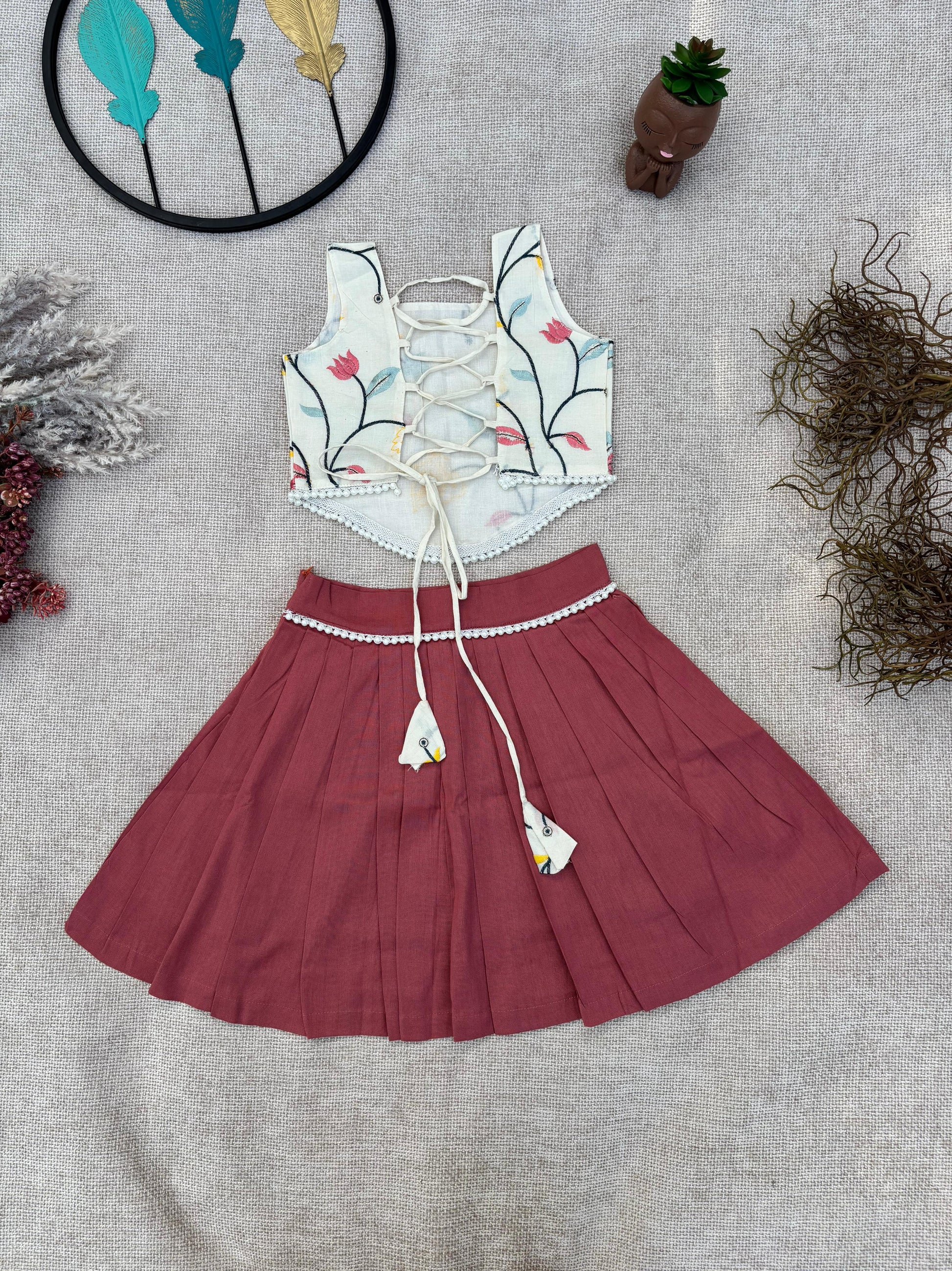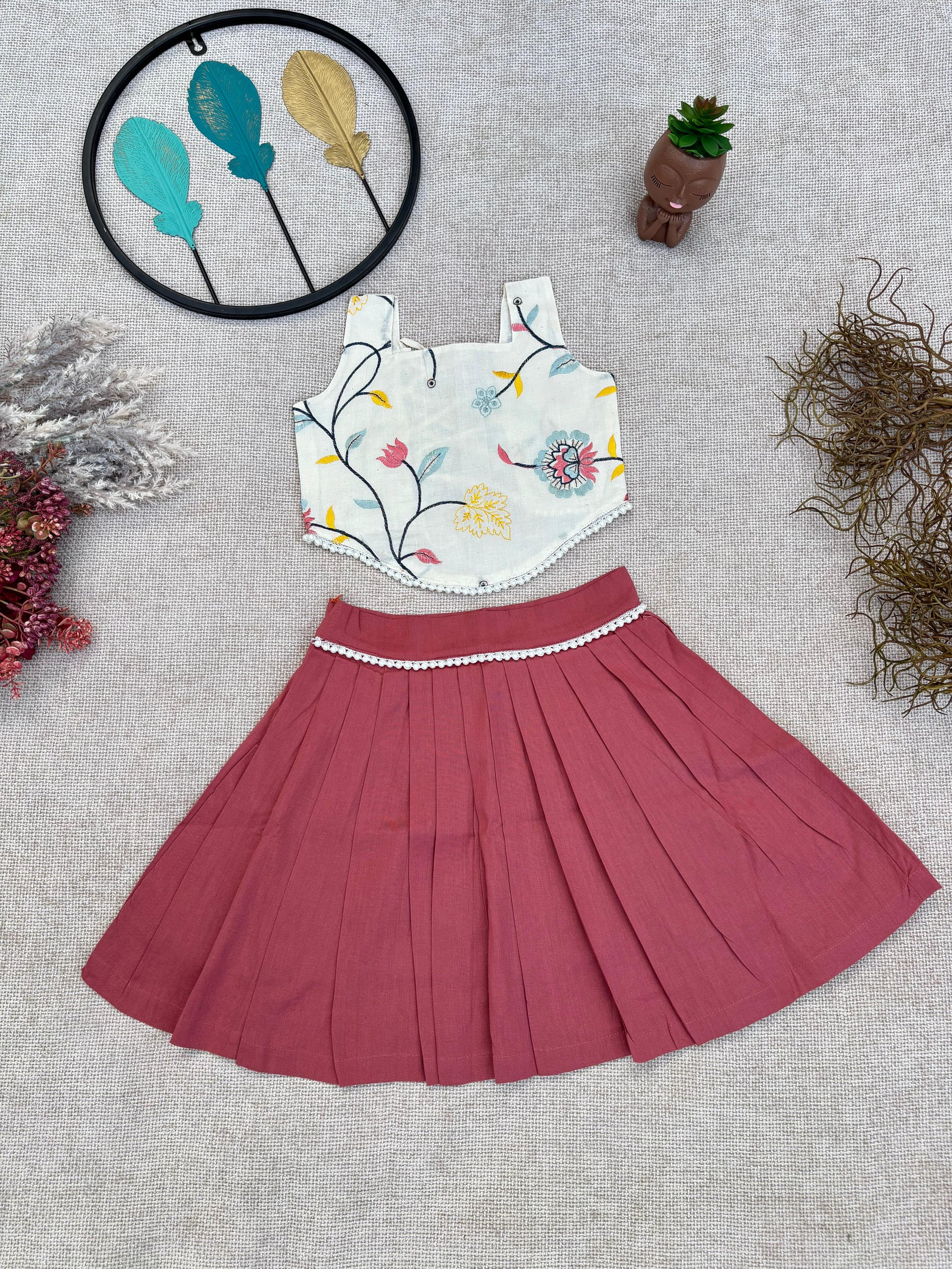 Bring charm and elegance to your little one’s wardrobe with this beautiful cream-colored embroidered set. Featuring a chic halter-style crop top with a stylish tie-up back and a matching flared skirt, this outfit is adorned with vibrant floral embroidery in shades of pink, purple, green, and yellow. Designed from soft and breathable fabric, it ensures all-day comfort while giving your child a graceful festive look.