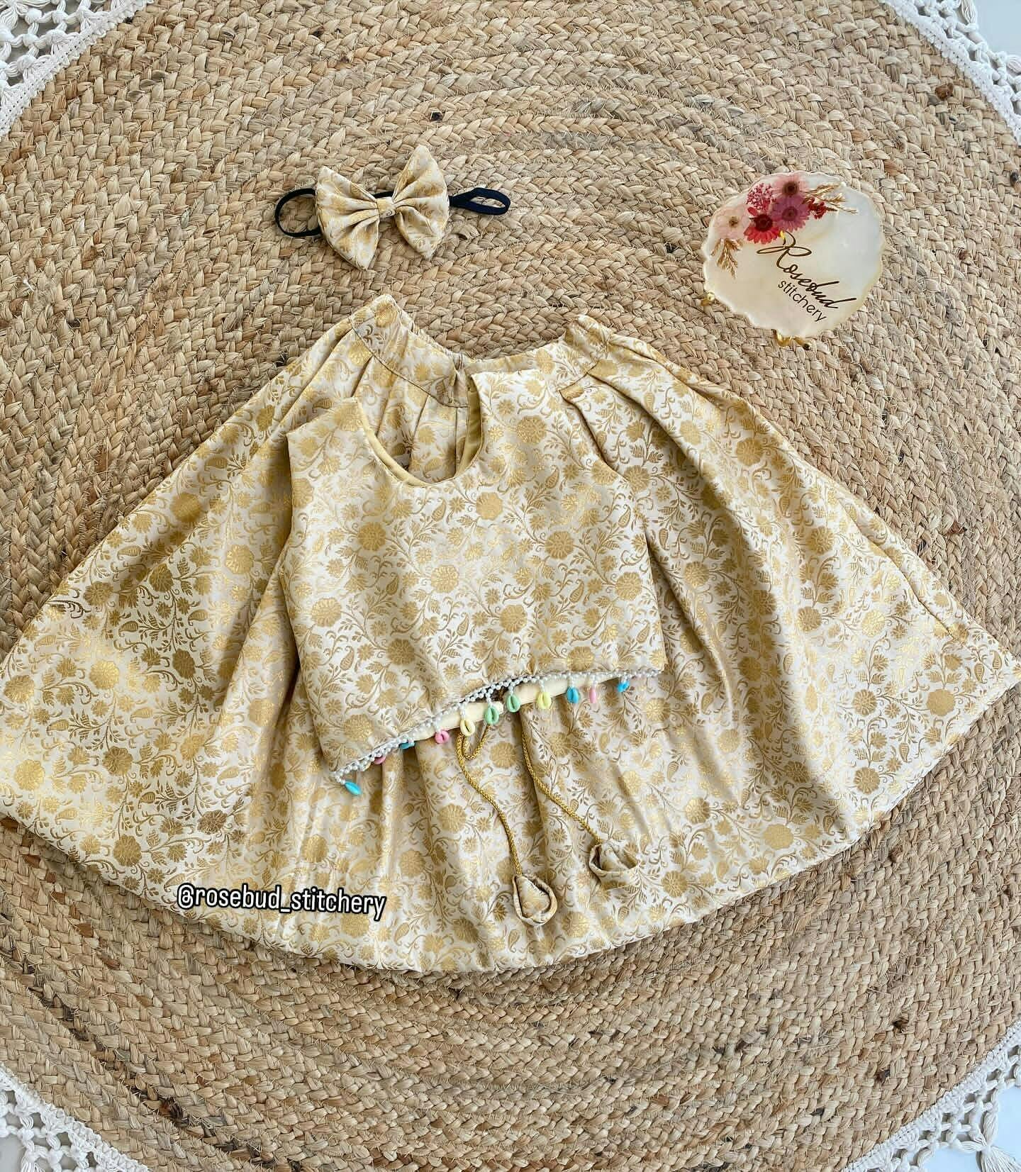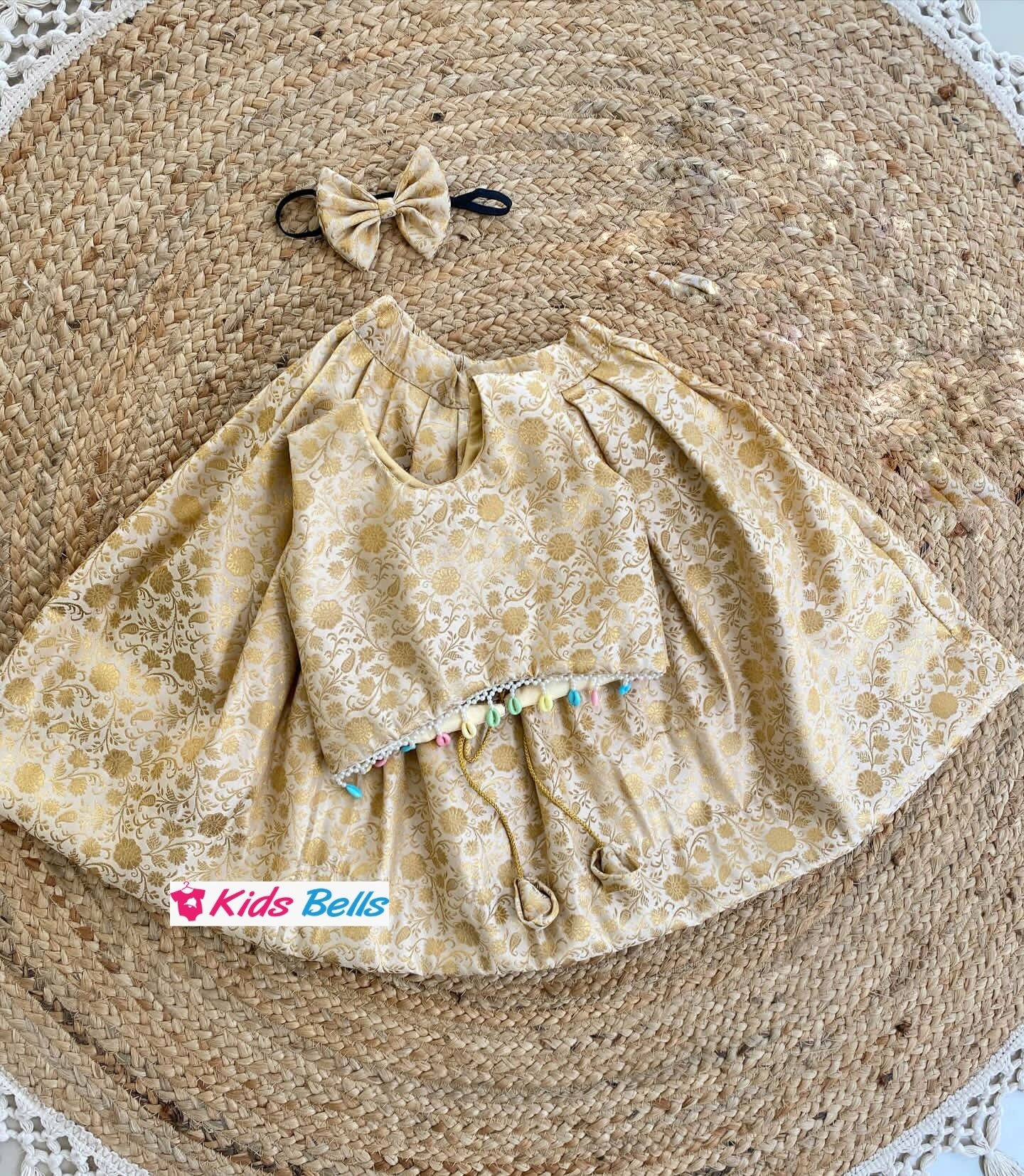 Girls’ Ethnic Golden Brocade Frock with Hair Accessory