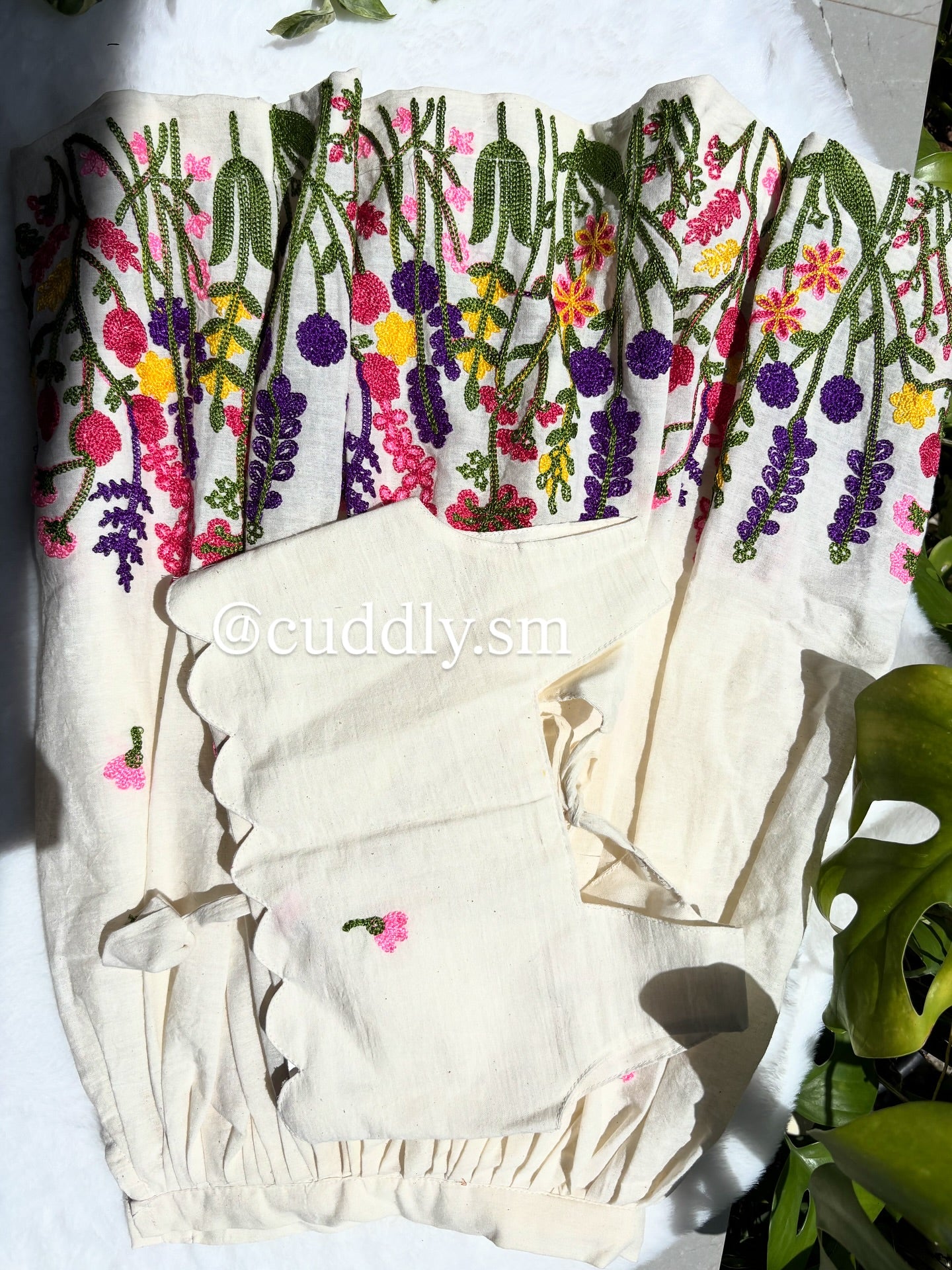 • Bottom: Flared skirt with multicolor threadwork embroidery