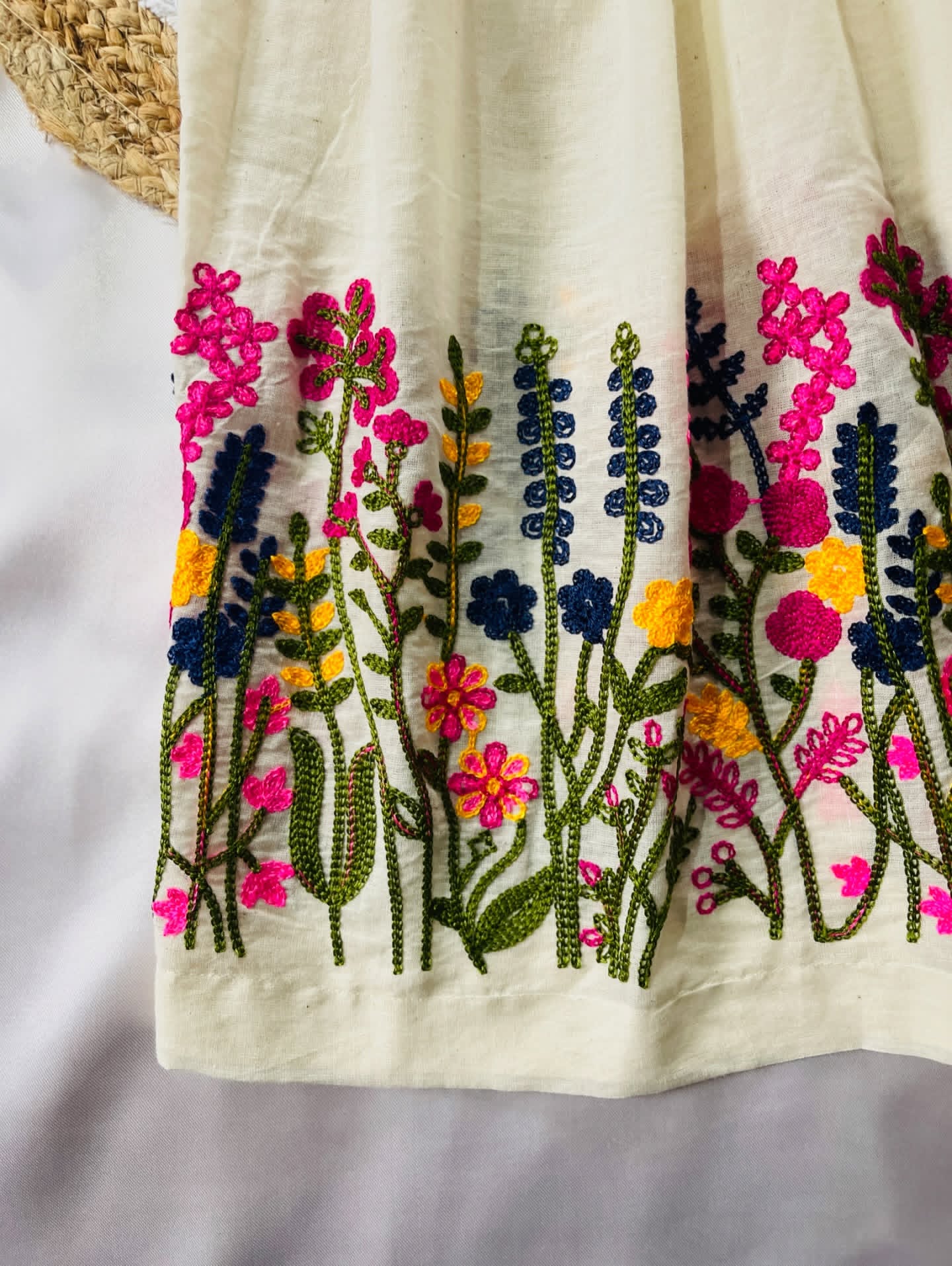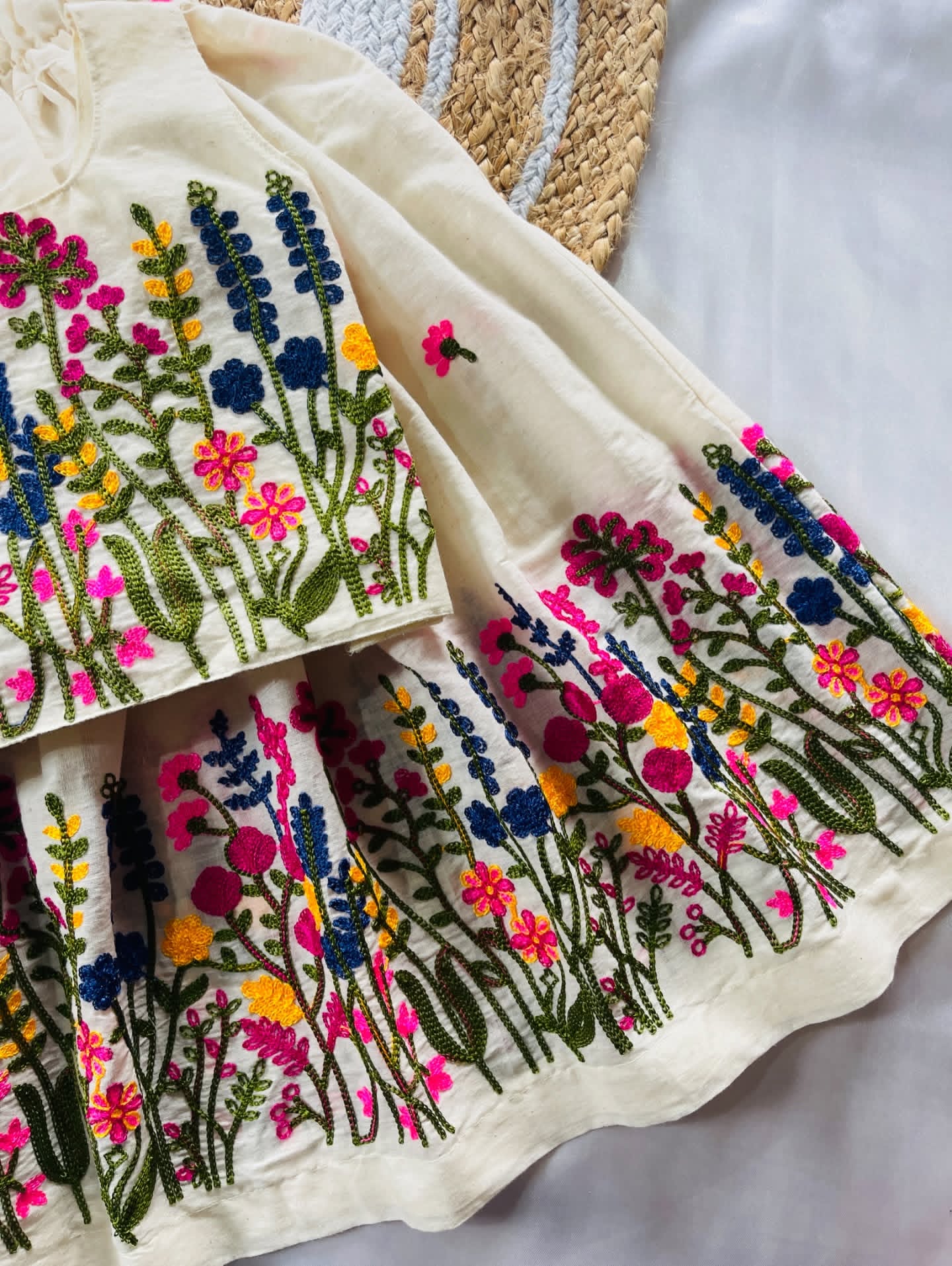 • Color: Ivory base with bright embroidery (pink, yellow, blue & green)