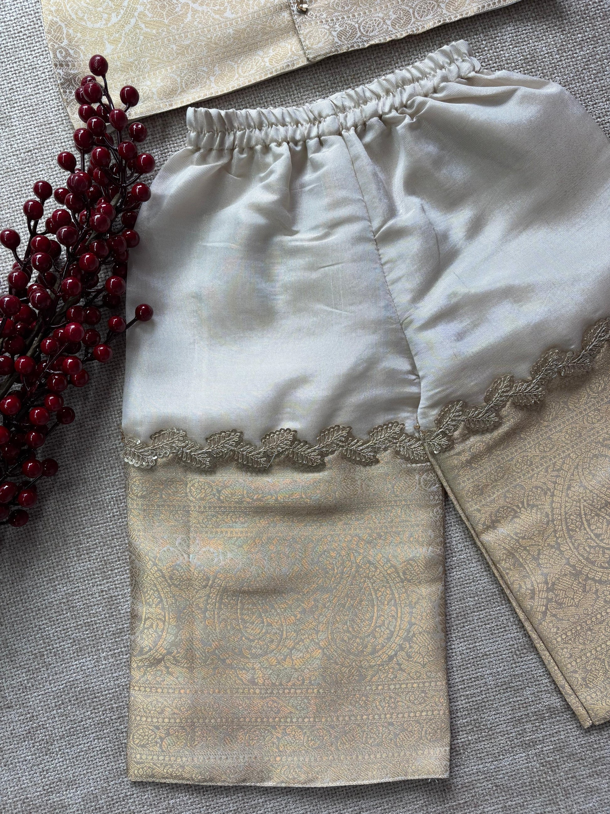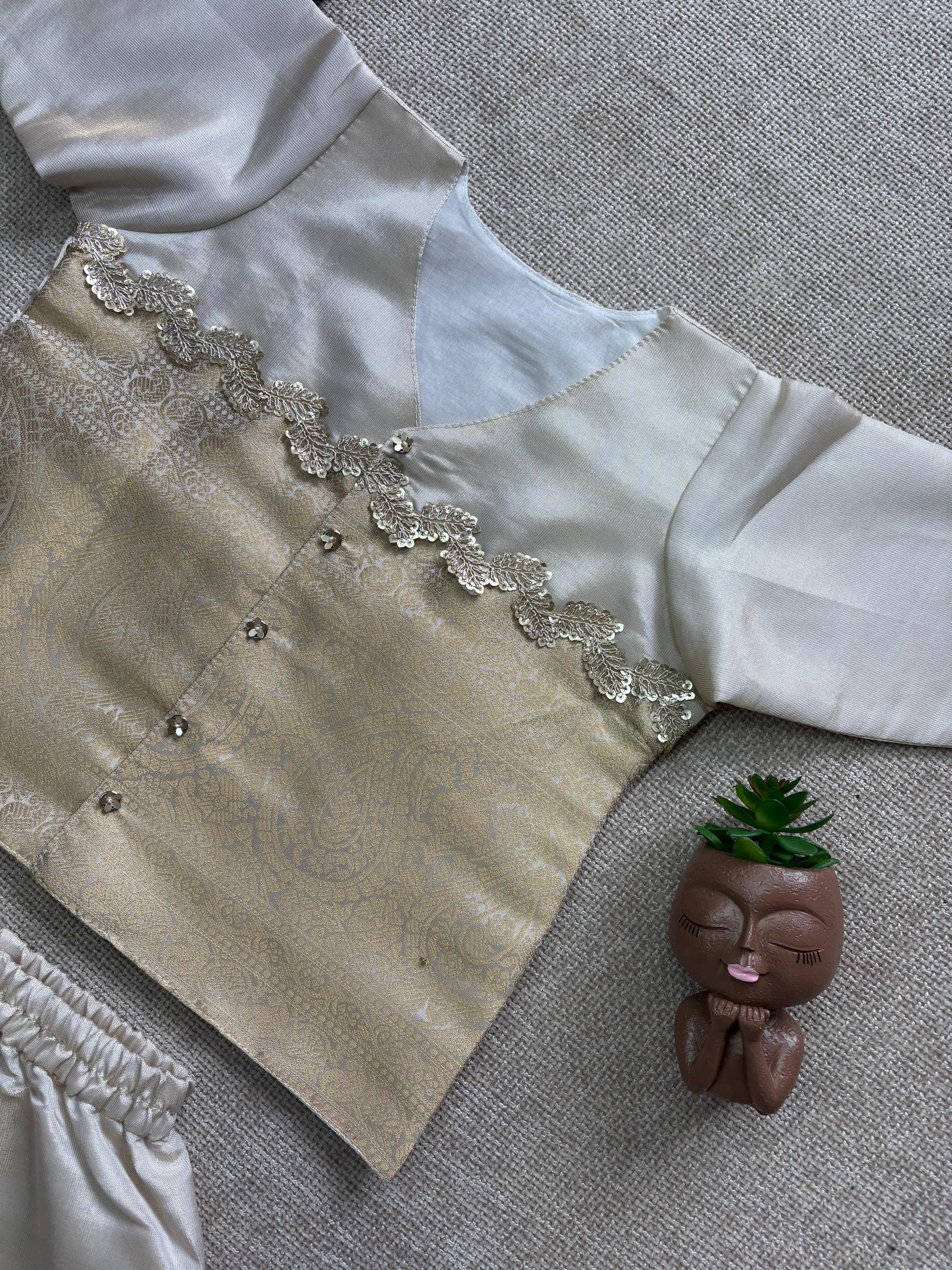 • Bottom: Matching cream-gold pants with paisley weave & lace detailing