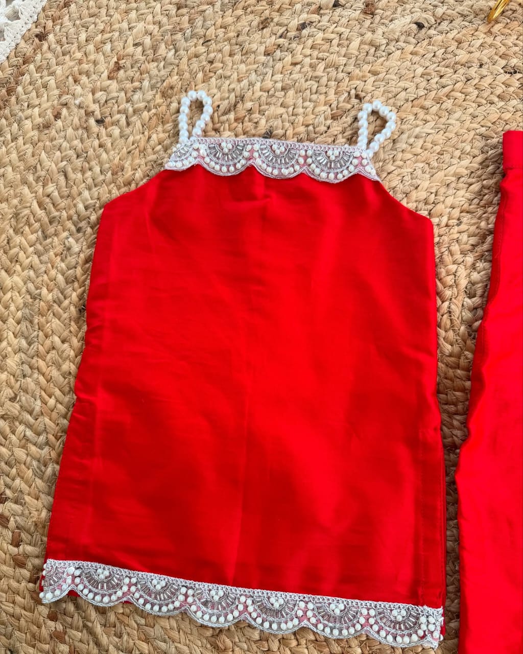 • Stylish red sleeveless camisole top with delicate white lace edging on neckline and hem