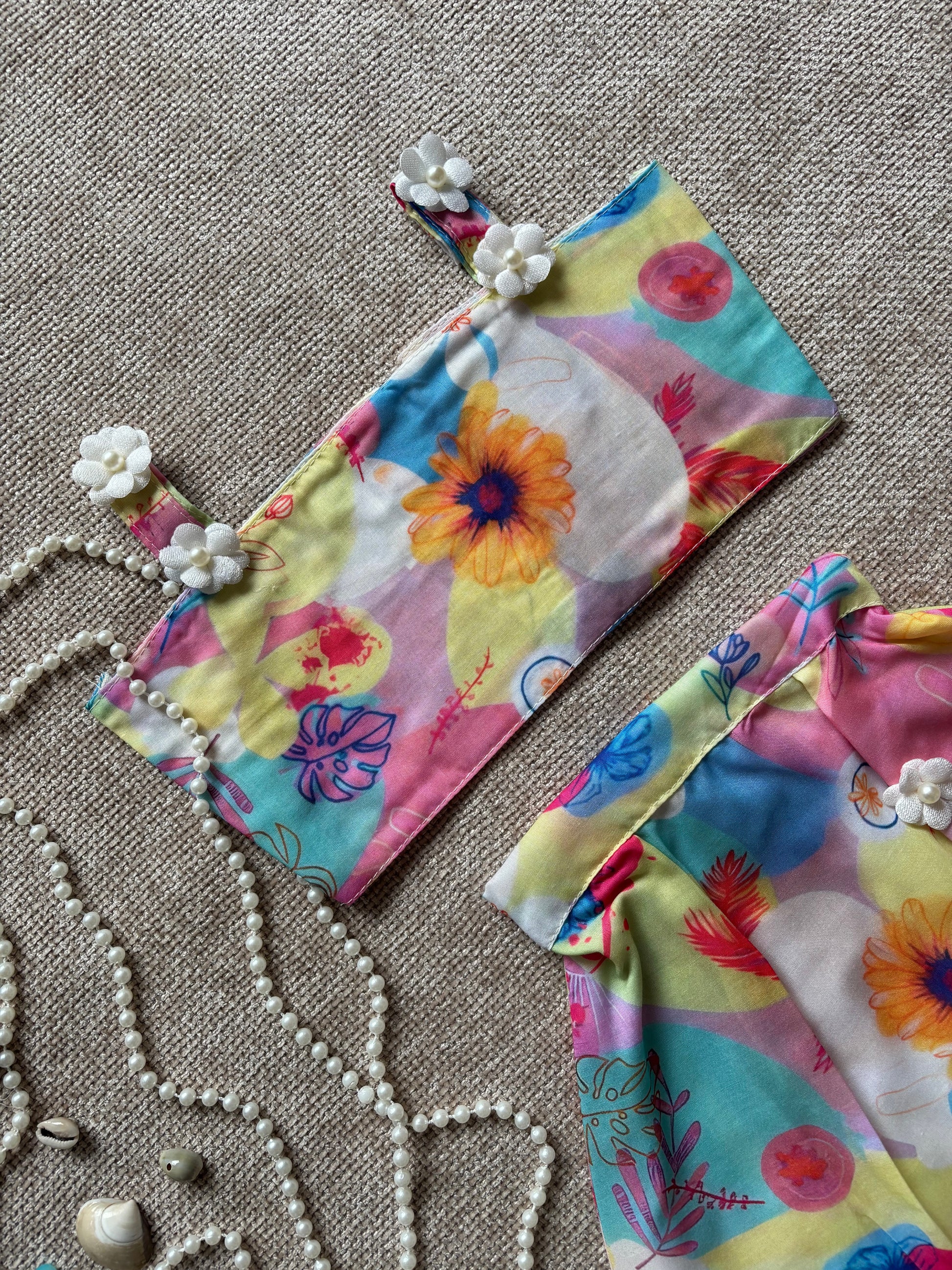 • Top: Sleeveless crop top with straight neckline and cute floral strap detailing