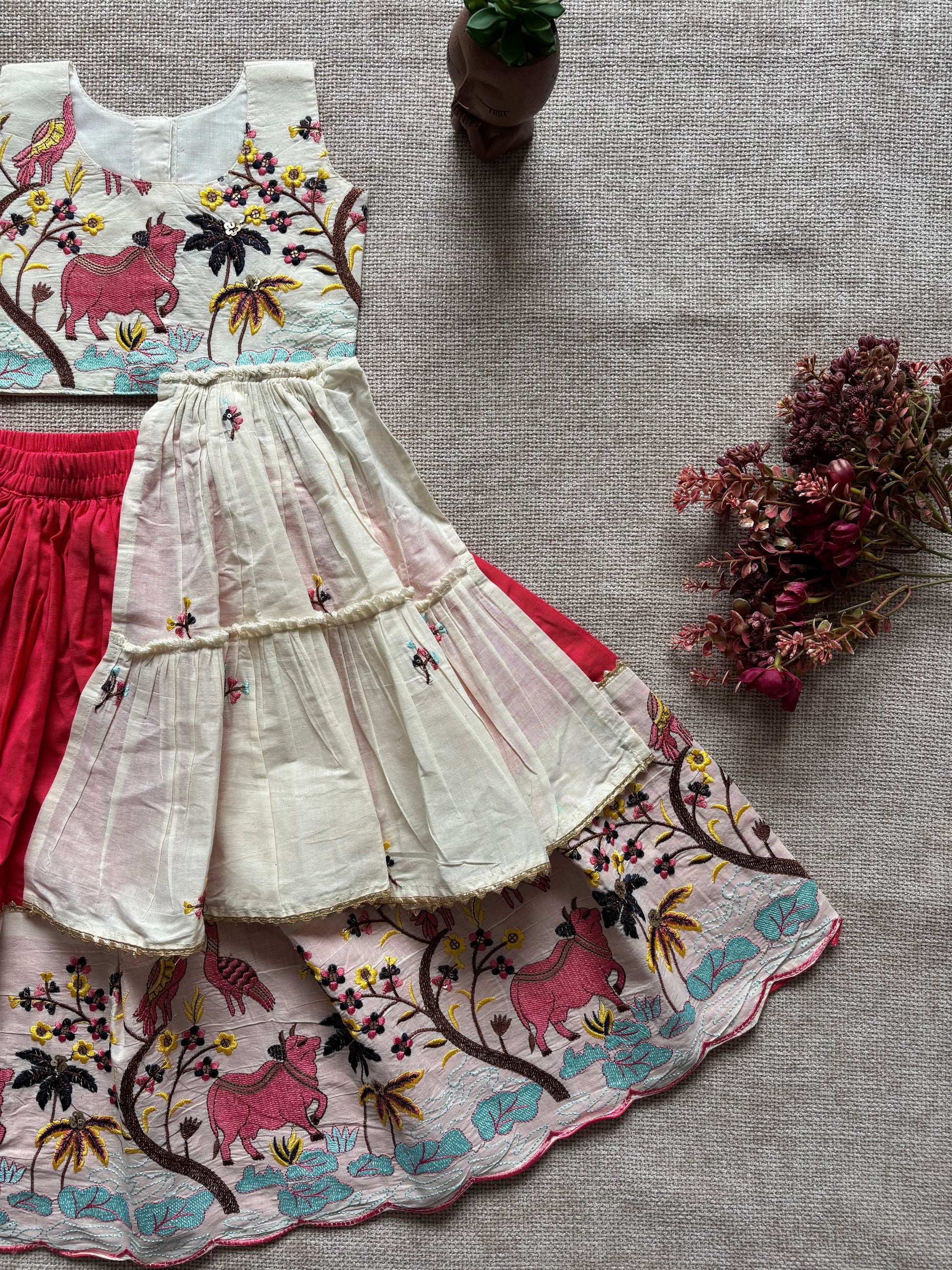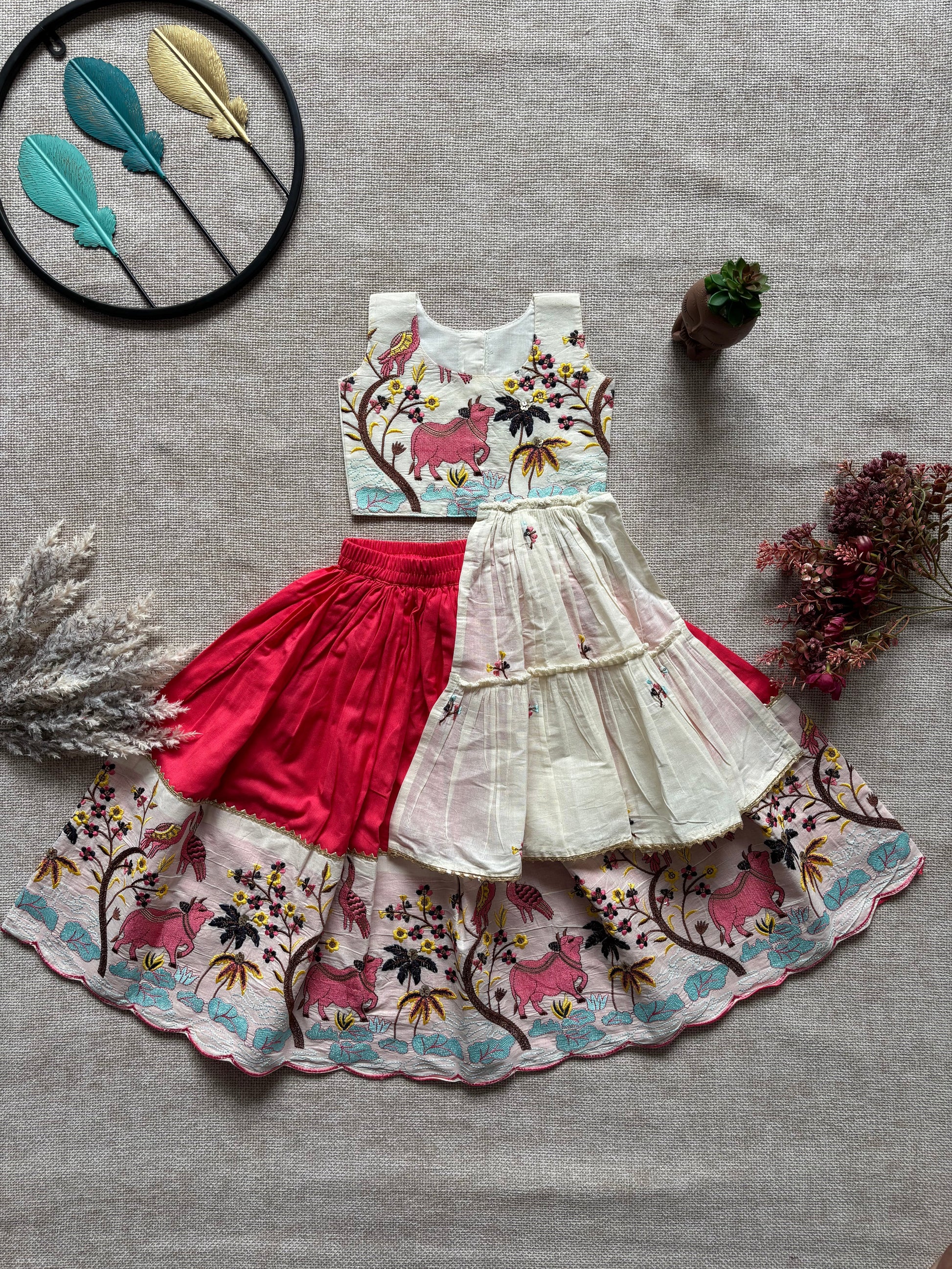 • FABRIC DETAILS : PURE KHADI SKIRT BOTTOM ATTACHED WITH WORK BROAD BORDER ATTACHED WITH LESS BORDE AND SLEEVE LESS TOP FRONT SIDE FRILL ATTACHED WITH LESS BORDE AND BACK OPENING DESIGNER STITCHING WORK FINISHING ALLOVES.